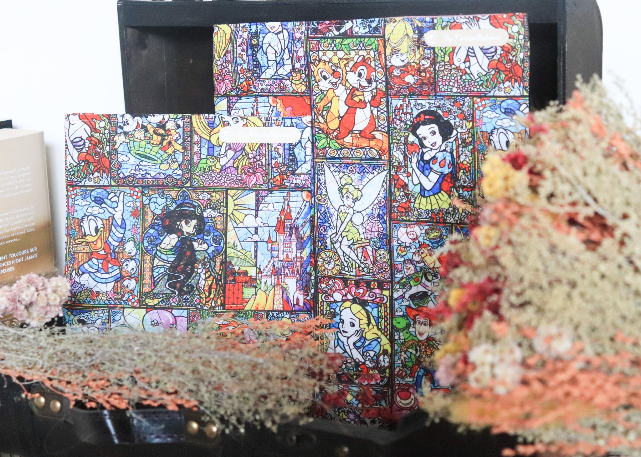🧵 TISSU : le tissu extérieur correspond à de nombreux personnages Disney représentés sous forme de vitraux, les couleurs sont très variées. Le tissu intérieur est de couleur mauve / parme.